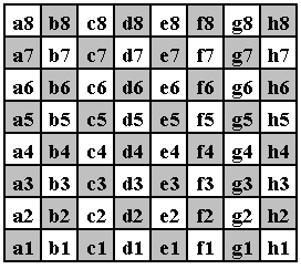 En este sistema cada columna esta representada por una letra (desde la "a" hasta "h"), y las filas por un número (desde "1" hasta "8"). Así, cada casilla tiene un nombre formado por una letra y un número, que corresponde a la columna y la fila a la cual pertenece.