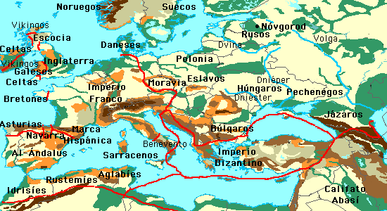 En 861 el hijo del Califa al-Mutawakkil se cansó de esperar el trono y organizó una conspiración por la que la guardia turca asesinó al Califa. Fue el principio del fin de la dinastía abasí, pues los turcos se dieron cuenta de que podían poner y deponer Califas a su antojo. Durante los años siguientes el poder efectivo estuvo en manos de funcionarios turcos que empezaron a transmitir sus cargos de padres a hijos pero, como se dividían en varias familias rivales, los turcos nunca llegaron a ser tan poderosos como podrían haber llegado a ser. Entre los jázaros, tradicionales aliados de constantinopla, se había difundido el islam, e incluso el judaísmo. Por ello Focio envió a dos misioneros para convertirlos al cristianismo. Eran dos hermanos griegos llamados Cirilo y Metodio. Roberto el Fuerte, se reconcilió con Carlos el Calvo (depués de haber apoyado contra él a Luis el Germánico y a Pipino) y a cambio recibió los títulos de vizconde de Angers y marqués de Neustria. El título de marqués se explicaba por la vecindad de su territorio con los bretones. Por otra parte, en 862 un noble llamado Balduino raptó a Judit, la hija de Carlos el Calvo, y luego se casó con ella. Con esto obtuvo del rey varios condados, entre ellos el de Gante y el de Flandes. El condado de Ampurias pasó a manos de Suñer II, el hijo del conde Suñer I que había muerto catorce años antes. No se sabe gran cosa sobre los condados de la marca hispánica durante este periodo ni de cómo Suñer II recuperó el título. Poco después decidió compartir el título de conde de Ampurias con su hermano Delá. Ese año murió Musá ibn Musá, mientras atacaba a su yerno Azrak ibn Mantil en tierras de Guadalajara. Unas tribus eslavas solicitaron, como iba siendo habitual, la ayuda de los varegos en algún conflicto, y una tribu varega acudió solícita al llamamiento. Era una tribu que se llamaba a sí misma Rus, y su jefe era Riúrik. Tomaron la ciudad de Nóvgorod y la convirtieron en su capital. Con el tiempo, los eslavos que aceptaron a los Rus como gobernantes (probablemente los mismos que habían asaltado Constantinopla dos años antes) fueron conocidos como Rusos. Naturalmente, puede cuestionarse si realmente los eslavos llamaron a los rus o si éstos se presentaron sin invitación y luego crearon esta historia como justificación, pero, de un modo u otro, parece ser que así nació el pueblo ruso. ![]() A medida que los pueblos eslavos formaban estados con pretensiones de estabilidad, sus relaciones diplomáticas con las potencias vecinas fueron cobrando importancia. En general, un paso poco menos que insalvable para mantener buenas relaciones con cualquiera de los dos imperios (teóricamente) romanos (el franco y el bizantino) era aceptar el cristianismo, pero cada imperio tenía su propia versión del cristianismo y de la elección dependía cuál iba a ser el aliado y cuál el enemigo. Así, el príncipe moravo Rotislav, vecino de los germanos, consideró más conveniente tener a los bizantinos como aliados, por lo que pidió a Constantinopla que les enviara misioneros para evangelizarlos según el rito oriental. Focio les envió a Cirilo y Metodio, que acababan de regresar de oriente. Éstos inventaron un alfabeto para transcribir las lenguas eslavas y tradujeron la Biblia, al tiempo que trataban de adaptar la liturgia a las costumbres eslavas. Similarmente, en 863 el kan búlgaro Boris I, vecino de los bizantinos, solicitó a Luis el Germánico que enviara misioneros a su tierra. Sin embargo, los bizantinos amenazaron con una intervención militar y Boris I aceptó los misioneros que le envió Focio. Fue bautizado como Miguel y tuvo como padrino al emperador Miguel III. A cambio, Constantinopla reconoció los derechos de los búlgaros sobre todos los territorios que dominaban de hecho. La aristocrácia búlgara se resistió a la conversión, pero pudo más el empeño del kan. Los banú Qasí habían representado un papel clave en la contención del reino de Asturias. Ahora Ordoño I vio facilitada su expansión y, para detener sus avances, Muhammad I envió un gran ejército al mando de su hijo Abd al-Rahmán y de Abd al-Malik. Ordoño I trató de cortarle el paso pero fracasó y sufrió una gran derrota. Tras la muerte del rey de Escocia Donald I, fue elegido rey su sobrino Constantino. Pasó todo su reinado combatiendo a los vikingos. El rey Harald I de Dinamarca murió asesinado. Fue sucedido por Gorm el Viejo, quien mejoró las fortificaciones construidas por el rey Godofredo para asegurar la frontera meridional. Se mostró bastante benevolente con el cristianismo. También murió Carlos, el rey de Aquitania hijo de Carlos el Calvo. Éste puso en su lugar a su segundo hijo, conocido como Luis el Tartamudo, y no tardó en rebelarse contra su padre en colaboración con el rey Salomón de Bretaña y con una expedición vikinga que penetró por el Loira. Roberto el Fuerte tuvo ocasión de mostrar la fidelidad jurada a Carlos el Calvo haciendo frente a la triple amenaza. El duque Hunfrido de Gotia había sido acusado de traición el año anterior, aunque había sido perdonado. Ahora tomó Tolosa, donde el conde Guillermo I murió defendiendo la ciudad. Más trascendente fue la muerte sin descendencia el rey Carlos de Provenza, cuyo reino fue repartido entre sus hermanos Lotario II y Luis II. Por aquella época Lotario II tenía un serio problema: tenía una esposa y una amante. Hasta aquí todo era normal, pero su esposa no le había dado ningún hijo, mientras que su amante sí. Si moría, el hijo bastardo, que se llamaba Hugo, no podría reclamar herencia alguna y su reino pasaría sin duda a manos de sus tíos (su hermano Luis II tenía únicamente una hija, o sea, nada, por lo que tras la muerte de ambos el reino medio llegaría a su fin). Para evitarlo tenía que repudiar a su esposa y casarse con su amante. El trámite para ello era conocido: consistía en acusar a su esposa de una lis