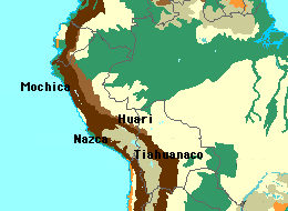 Los mochicas habían coexistido con los Nazcas, un pueblo pacífico que vivía en pequeñas aldeas dedicado a la algricultura y el pastoreo y en el que no se advierten signos de grandes señores poderosos. Habían sido grandes tejedores que dominaban el bordado, la tapicería, el brocado, las gasas, el punto de aguja, etc. Pero lo más destacado de esta cultura son dos extrañas construcciones: una es un monumento consistente en largas hileras de troncos durísimos hincados en el suelo formando grupos, y otra es una red de líneas y figuras de animales trazadas en el suelo por medio de piedrecillas y que forman imágenes de tal tamaño que sólo pueden ser apreciadas desde aviones. No se conoce su finalidad, y no ha faltado quien pretendiera ver en ellas un campo de aterrizaje para naves extraterrestres. En su lugar se estaban imponiendo las culturas de Tiahuanaco y Huari. La cultura de Tiahuanaco, que ya contaba con dos siglos de antigüedad, se extendió por el altiplano boliviano, en la ribera del lago Titicaca. Entre sus principales monumentos destaca la pirámide Acapana, en un recinto al que se accedía por la monolítica Puerta del Sol (un bloque de andesita de tres metros de alto por casi cuatro de ancho en el que se talló una puerta rectangular). En general, las construcciones de Tiahuanaco tienden a ser monumentales, con grandes bloques de piedra representando figuras poco detalladas. Su cultura fue más militarista y no tardó en unificar el mundo andino. Sobre Huari se sabe menos, pero hay indicios de que fue una segunda capital de Tiahuanaco y constituyó el centro de un gran imperio. Se calcula que debió de albergar unas 40.000 personas.