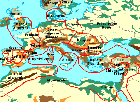del japonés moderno. Volviendo a Yoshitsume, su hermano Yoritomo receló de la popularidad que había adquirido a raíz de su victoria frente a los Taira y llevó a cabo una campaña contra él. Juan sin Tierra cumplió los dieciocho años, y su padre, Enrique II Plantagenet, decidió que no debía hacer honor a su apodo por más tiempo. Era su hijo favorito, pues, a diferencia de sus hermanos, nunca se había rebelado contra él. Por eso le otorgó el gobierno de sus posesiones en Irlanda. Sin embargo el joven se mostró incapaz de dominar a los señores normandos y nueve meses después, ya en 1186 tuvo que volver a Inglaterra. Ese año su hermano Godofredo fue arrojado de su caballo en un torneo y murió a causa de las heridas. El emperador Federico I Barbarroja concertó el matrimonio de su hijo Enrique con Constanza, hija póstuma del rey Roger II de Sicilia y tía del rey actual, Guillermo II, el cual no tenía descendencia y, por consiguiente, Constanza era la heredera legítima del reino. Si todo salía bien, esta alianza podía desembocar en la anexión de la Italia normanda al Sacro Imperio Romano. Después, el dominio del norte de Italia sería cosa fácil. El conde Alberto III de Habsburgo incorporó a las posesiones familiares el condado de Zürich y el landgraviato de la Alta Alsacia. Un monje alemán llamado Meinhard fundó un obispado católico en Livonia, desde donde se inició la evangelización de este territorio, todavía pagano. En Ceilán murió el rey Parakramabahu I, y tras él empezó la decadencia de su reino, que se vio amenazado por los Tamiles, procedentes de la India. Los cingaleses tuvieron que ir trasladándose paulatinamente hacia el sur, de capital en capital. Saladino llamó de nuevo a Egipto a su hermano al-Malik al-Ádil y encomendó Damasco a su hijo al-Malik al-Afdal. El joven rey Balduino V de Jerusalén murió a los pocos meses de ocupar el trono y su madre, Sibila de Anjou, coronada reina, asoció al trono a su marido Gui de Lusignan. Reinaldo de Châtillon volvió a interceptar una rica caravana y ello agotó la paciencia de Saladino, que nuevamente declaró rota la tregua firmada con el rey Balduino IV. En 1187 reunió un gran ejército y marchó sobre Palestina. Mientras tanto murió sin descendencia el conde Raimundo III de Trípoli, y el condado pasó a Raimundo IV, el hijo del príncipe Bohemundo III de Antioquía, al que Raimundo III había adoptado poco antes de morir. No se sabe muy bien qué sucedió entonces, pero al parecer su hermano menor Bohemundo IV se las arregló para quedarse con el condado y Raimundo IV murió. Bohemundo IV se alió con Saladino, que empezó a descender hacia Jerusalén. El rey Gui de Lusignan reunió todas las fuerzas cruzadas, incluyendo a los caballeros templarios y hospitalarios, y partió para hacer frente a los musulmanes. Los ejércitos chocaron en Hattin, cerca del lago Tiberíades. Los cruzados eligieron mal el terreno y dejaron atacar insensatamente a los templarios. Fueron arrollados. Todos los templarios y hospitalarios capturados fueron ejecutados, y Saladino ejecutó personalmente a Reinaldo de Châtillon, tal y como había prometido tiempo atrás. Gui de Lusignan también fue capturado, pero fue retenido con vida para cobrar un rescate. Ese año murió el rey Rubén III de Armenia y fue sucedido por su hermano León II el Magnífico, quien rechazó a los musulmanes, conquistó Isauria y se declaró vasallo del emperador Federico I Barbarroja. Trasladó la capital del reino de Tarso a Sis. El rey de Servia Esteban Nemanja extendió su estado conquistando Montenegro, Dalmacia, Herzegovina y la Servia Danubiana. Mientras tanto Juan I Asen se proclamó rey de Bulgaria y obligó al emperador bizantino Isaac II a reconocer el llamado Segundo Imperio Búlgaro. Ocupó la llanura del bajo Danubio (Mesia y Valaquia) en donde instaló su capital, Tarnovo. Conrado de Monferrato se casó con Teodora, hermana del emperador Isaac II, pero se separó de ella poco después. El rey almorávide Muhammad, de las islas Baleares, fue derrocado y sucedido por su hermano Tasufin, que a su vez fue derrocado por un ejército enviado a toda prisa desde África por su hermano Alí, que puso en el trono a otro hermano, Abd Allah. Por su parte, Alí fue derrotado por una gran expedición enviada por el Califa almohade Yúsuf II. Los rebeldes fueron empujados hacia Libia. En octubre Saladino entró en Jerusalén. Pocos días después murió el Papa Urbano III y fue elegido como sucesor Alberto di Mora, que adoptó el nombre de Gregorio VIII. La noticia de la caída de Jerusalén conmocionó a occidente, e inmediatamente surgió el proyecto de una Tercera Cruzada. Es interesante que la imagen que llegó de Saladino a occidente no fue la de un hereje fanático, sino todo lo contrario. En sus relaciones con los cruzados sus actitudes se ajustaban más a los ideales caballerescos que las de cualquier caballero occidental. Pronto se propagaron leyendas por Europa que hacían de él un héroe casi cristiano. Ciertamente, Saladino fue un buen gobernante y sus súbditos cristianos no tuvieron motivos de queja, pero, desde luego, no tenía nada de cristiano. Al contrario, su guía fue siempre obrar de acuerdo con el islam. Dedicó grandes esfuerzos a regenerar material y moralmente sus dominios. Egipto no había estado tan bien gobernado desde los tiempos de Ptolomeo III. Gregorio VIII murió en diciembre, y fue sucedido por Paolo Scolari, que adoptó el nombre de Clemente III y, gracias al fervor cristiano que suscitaron los preparativos de la Cruzada, pudo entrar en Roma. En 1188 Saladino dominaba todo el reino de Jerusalén excepto Tiro, que estaba defendida por Conrado de Monferrato. Conrado pagó el rescate por el rey Gui de Lusignan, que inmediatamente se puso a organizar a los cruzados. Poco antes había muerto el marqués Guillermo de Monferrato, el padre de Conrado, así que éste volvió a Italia para tomar posesión de la h