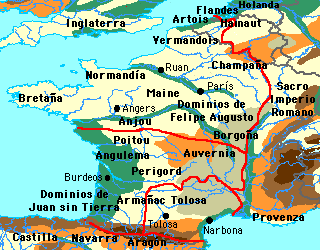 Incidentalmente, fue durante el reinado de Felipe Augusto cuando la flor de lis, símbolo de pureza, pasó a ser el símbolo de la monarquía francesa. Luis VI y Luis VII ya habían acuñado monedas con este emblema, pero fue Felipe Augusto quien cambió el estandarte rojo con leones y leopardos (que teóricamente se remontaba a los tiempos de Carlomagno) por el estandarte de las flores de lis en oro sobre azur. En Inglaterra murió Hubert Walter, el arzobispo de Canterbury. Y el rey Juan se interesó en la cuestión de la sucesión. Después de sus derrotas en Francia necesitaba dinero, y tener bien sujeta a la Iglesia acababa proporcionando dinero. Sin embargo, Juan sin Tierra era uno de los pocos monarcas europeos a los que el Papa Inocencio III no había tenido ocasión de llevar la contraria hasta ahora y, naturalmente, el pontífice no dejó pasar la oportunidad. Designó a su propio candidato, que resultó ser Stephen Langton, que tenía ganada una reputación de sabio, pero había estudiado en la Universidad de París y era más francés que inglés, por lo que era completamente inaceptable para Juan. Se inició así una guerra diplomática entre Inglaterra y la Santa Sede. Pedro de Castelnau, el legado de Inocencio III ante el conde Raimundo VI de Tolosa, no estaba obteniendo resultados en su misión de combatir la herejía albigense, así que le envió como refuerzos a dos castellanos: el obispo de Osma, Diego de Acevedo y su ayudante, Domingo de Guzmán. Acababan de regresar de una embajada ante el rey de Dinamarca y, tras una breve estancia en Roma, se dirigieron a Tolosa. Mientras tanto continuaba la guerra entre