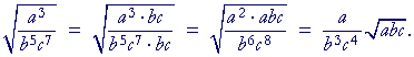 Example 8. Simplify Solution. The denominator must be a perfect square. It must be composed of even powers. Therefore, make the denominator into a product of even powers simply simply by multiplying it -- and the numerator -- by bc. Then extract half of the even powers.