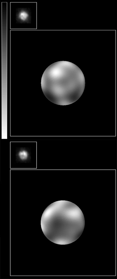 Imágenes de Plutón y su satélite Caronte obtenidas por el HST en las que se aprecian contrastes en sus superficies.