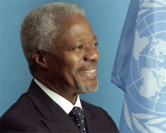 Posteriormente y durante seis años (1965-1971), Kofi Annan formó parte de la Comisión Económica Africana, para más tarde regresar a los Estados Unidos donde completó sus estudios en el Instituto Tecnológico de Massachusetts, en el que estudió Administración de Empresas. Al finalizar su preparación, volvió a Ghana, donde se encargó de promocionar el turismo de su país hasta que en 1976 fue contratado por la Organización de las Naciones Unidas (ONU). En este organismo fue subiendo paulatinamente de categoría; así, en 1993 fue elegido máximo responsable de las operaciones de paz durante la guerra civil en Bosnia-Herzegovina. Hasta que, en 1996, fue elegido secretario general de la ONU para el período 1997-2001, en sustitución de Butros-Ghali, con el apoyo de EE UU, país que deseaba especialmente una drástica reducción de gastos por parte de dicho organismo. En febrero de 1998 medió entre EE UU e Irak para que este país aceptara las condiciones impuestas por el primero, consiguiendo así detener la escalada de amenazas entre ambos países que parecía conducir a una inminente guerra. En junio de 2001 resultó reelegido para un nuevo mandato, y en octubre de ese mismo año, su labor al frente de Naciones Unidas fue reconocida con la concesión del Premio Nobel de la Paz. |