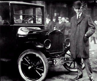 Al mismo tiempo, la dirección de la empresa adquiría un control estricto sobre el ritmo de trabajo de los obreros, regulado por la velocidad que se imprimía a la cadena de montaje. La reducción de los costes permitió, en cambio, a Ford elevar los salarios que ofrecía a sus trabajadores muy por encima de lo que era normal en la industria norteamericana de la época: con su famoso salario de cinco dólares diarios se aseguró una plantilla satisfecha y nada conflictiva, a la que podía imponer normas de conducta estrictas dentro y fuera de la fábrica, vigilando su vida privada a través de un «departamento de sociología». Los trabajadores de la Ford entraron, gracias a los altos salarios que recibían, en el umbral de las clases medias, convirtiéndose en consumidores potenciales de productos como los automóviles que Ford vendía; toda una transformación social se iba a operar en Estados Unidos con la adopción de estos métodos empresariales. El éxito de ventas del Ford T, del cual llegaron a venderse unos 15 millones de unidades, convirtió a su fabricante en uno de los hombres más ricos del mundo, e hizo de la Ford una de las mayores compañías industriales, hasta nuestros días. Fiel a sus ideas sobre la competencia y el libre mercado, no intentó monopolizar sus hallazgos en materia de organización empresarial, sino que intentó darles la máxima difusión; en consecuencia, no tardaron en surgirle competidores dentro de la industria automovilística, y pronto la fabricación en cadena se extendió a otros sectores y países, abriendo una nueva era en la historia industrial. Henry Ford, por el contrario, reorientó sus esfuerzos hacia otras causas en las que tuvo menos éxito: fracasó primero en sus esfuerzos pacifistas contra la Primera Guerra Mundial (1914-18); y se desacreditó luego organizando campañas menos loables, como la propaganda antisemita que difundió en los años veinte o la lucha contra los sindicatos en los años treinta. |