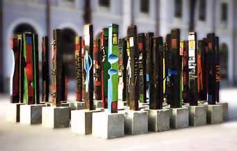 En 1987 se celebró en Madrid una exposición antológica de su obra, en la que aparecían por primera vez otros dos aspectos de su actividad creadora: las construcciones escultóricas realizadas con traviesas de ferrocarril usadas, una de las cuales preside una fachada interior de la estación de Abando en Bilbao; también aparecían en esta muestra imágenes de su intervención pictórica en el bosque de Oma, cercano a Gernika, donde reside el artista. La pintura de Ibarrola, presente en varios museos y colecciones de Europa, fue evolucionando hacia un poderoso expresionismo donde, al paso que se recogen las tradiciones plásticas del arte vasco, se exalta el mundo industrial contemporáneo con las masas laborales como protagonistas, todo ello planteado con una grandeza monumental que se reclama cada vez más del muralismo.