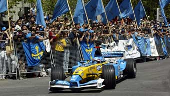 Tras la experiencia con Minardi, Flavio Briatore, dueño de Renault, por el que había fichado para cinco años, lo llamó de Minardi, donde estaba cedido, para ejercer durante todo el año 2002 como probador de la marca francesa, con resultados más que satisfactorios. En 2003 fue ya piloto oficial de Renault, una marca más competitiva pero muy lejos aún de los Ferrari, los Williams o los McLaren. Pronto se consolidó como la revelación del campeonato, sobre todo a partir de que, el 22 de marzo, se convirtiera en el piloto más joven en lograr la pole position en el Gran Premio de Malasia, donde además, con su tercer puesto, fue el primer piloto español en subir al podio. Consiguió esa pole a los 21 años, 7 meses y 22 días, superando ampliamente a quien ostentaba el récord, Rubens Barrichello (22 años, 3 meses y 5 días) o a campeones como Jackie Ickx (23 años, 8 meses y 3 días), Ayrton Senna (25 años y 1 mes) y Michael Schumacher (25 años, 4 meses y 12 días). A lo largo de la campaña destacaría nuevamente con un subcampeonato en el Gran Premio de España celebrado en Montmeló, pero sobre todo en el Gran Premio de Hungría, donde se impuso con autoridad y se coronó en lo más alto de la fórmula 1 sacándole 26,6 segundos a su inmediato competidor, Kimi Raikkonen, y doblando nada menos que al campeón del mundo, Michael Schumacher. Con 22 años y 26 días Alonso entraba en la historia de la fórmula 1 al ser el más joven en lograr la victoria, superando el récord de Troy Ruttman (22 años y 80 días) y Bruce McLaren (22 años y 104 días), quienes ganaron en 1952 y 1959. Todos estos buenos resultados hicieron que Fernando Alonso acabara el Mundial en una meritoria sexta plaza, por debajo de Ralf Schumacher y Rubens Barrichello. Sin duda, fue la revelación de la temporada y todo hacia pensar que el siguiente año sería el de su consolidación definitiva. Pese a todo, a lo largo del Mundial 2004 una vez más Schumacher se mostró imbatible y Alonso acabó la temporada sin haberse podido alzar con ningún triunfo. En la retina de muchos aficionados quedan, pero, sus grandes carreras conduciendo como un verdadero campeón y los diferentes podios conseguidos en los circuitos de Francia, Austria, Inglaterra y Hungría. De esta manera, el piloto español siguió destacando y quedó en el cuarto puesto del campeonato del mundo, con 59 puntos. Finalmente, en el 2005, llega la consolidación de Fernando Alonso como piloto de Fórmula 1. Esta temporada es la más importante del automovilismo español hasta la fecha por ser la primera en que un piloto nacional esté muy cerca de convertirse en Campeón del Mundo de la especialidad. Ha sido un año ciertamente espectacular para Alonso, quien desde la pretemporada ha sabido establecer las bases de este gran triunfo. Los primeros entrenamientos de la temporada 2005 ya mostraron un Fernando especialmente fuerte como rival del gran Michael Schumacher y muy bien respaldado por su escudería: Jarno Trulli dejó Renault y Giancarlo Fisichella se convirtió en su nuevo compañero. También su nuevo monoplaza R-25 ayudaba al piloto con espectaculares cambios sobre el coche del año pasado: esencialmente un motor más potente y mejoras aerodinámicas en el chasis para adaptarse a la normativa de la FIM. Su espléndida conducción ha permitido a Fernando Alonso estar a punto de ser nada menos que el primer español y el piloto más joven en convertirse en Campeón del Mundo de la máxima categoría del automovilismo. Son contadas las carreras en las que no ha triunfado y numerosos los podios que ha conseguido. Los Grandes Premios de Australia, Malasia, Bahrein, San Marino (donde ganó después de un apasionante duelo con Schumacher), Francia, Alemania y España han sido algunas de sus mejores victorias de este año. La personalidad de un líder En 1999 Alonso conoció en un campeonato de karts a la que hoy es su novia, Rebeca, estudiante de música en el Conservatorio de Avilés, donde toca el violonchelo. Se ven poco, porque Fernando vive en Oxford, donde tiene su sede el equipo. Según las personas de su círculo íntimo tiene casta, carácter y una desmesurada confianza en sí mismo. Está convencido de que nadie puede sacarle más partido que él al coche que conduce. Y, según Adrián Campos y otros expertos, tiene un talento natural, que Fernando potencia con entrenamientos muy duros. Además, a pesar de su carácter serio en los circuitos, tiene un carisma que enamora a la gente. En familia y con las amistades, es bromista y divertido. En casa le apodan Nano, su rivales Magic y la prensa el Toro, debido a su gran envergadura en un joven de 1,71 de altura y 70 kilos de peso. Es un apasionado de todos los deportes, que utiliza como entrenamiento. Practica el ciclismo, el tenis, la natación y el fútbol, en el que su equipo preferido es el Real Madrid. Su comida preferida, aparte de los guisos asturianos de su madre, es la pasta, le encanta el cine de terror y su ídolo deportivo por excelencia es el ciclista que logró vencer al cáncer: el estadounidense Lance Armstrong. Como él, aspira a ser un consumado campeón, en otra modalidad. |