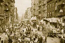 Mulberry Street en la ciudad de Nueva York, también conocida como "La Pequeña Italia", en los inicios del siglo XX. En ese periodo, las familias inmigrantes recién llegadas, sobre todo del este y el sur del Europa, se asentaban a menudo en enclaves urbanos muy poblados. De ordinario sus hijos o sus nietos se dispersaron después a otras ciudades o regiones del país. (Library of Congress)