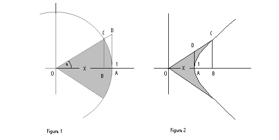 De la misma manera que en el caso de las funciones trigonométricas habituales, el área sombreada de la hipérbola que se corresponde con un ángulo 2a tomando OA como la unidad, es a . Llamemos x al área del sector de ángulo 2a (que hemos visto es igual a a).