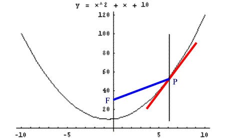 La parábola tiene una propiedad interesante: Si unimos cualquier punto, P, de la parábola con su foco, el ángulo que forman el radio focal con la tangente en ese punto, es igual al al ángulo que forma la tangente en ese punto con la recta paralela al eje de la parábola.