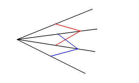 Las barras de colores rojo y azul están fijas en su extremo más cercano al vértice en un punto situado a la misma distancia en los cuatro brazos del compás. El otro extremo de las barras de colores se puede deslizar solidariamente con la barra compañera.