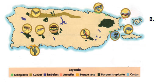 2. Con que color se representan los embalses en este mapa? C. Identifica el ecosistema donde habitan algunas especies de la fauna y la flora de Puerto Rico. Usa la leyenda.