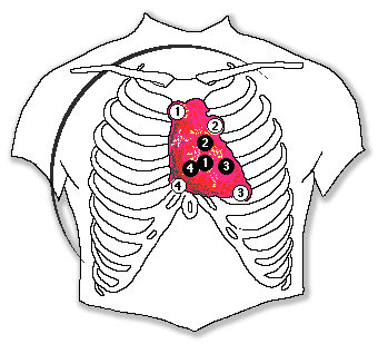 corazón en la pared anterior del tórax indicando el sitio de proyección y sitio de