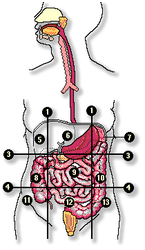 La pared ántero lateral del abdomen puede ser dividida, a través de los planos subcostal y supra crestal y de la línea medio clavicular en nueve regiones denominadas: en la línea media, de cefálico a caudal epigastrio, umbilical, hipogastrio; lateralmente (derecha e izquierda) y en el mismo sentido, hipocondrio, flanco y fosa ilíaca. Esta división es importante desde el punto de vista clínico-quirúrgico, ya que la sintomatología de las vísceras abdominales es referida a las regiones antes mencionadas.
