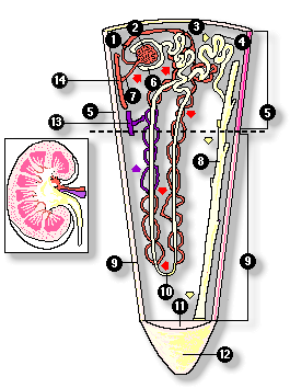 Al glomérulo, una malla capilar, llega una arteriola aferente y sale una arteriola eferente de menor calibre esta diferencia genera una presión hidrostática que favorece la salida de líquido hacia la cápsula glomerular (orina primaria). A medida que la orina circula por el sistema tubular, se va concentrando, recuperando el sistema vascular el 99% del agua filtrada. El 1% restante altamente concentrada es vertida por el túbulo colector, en el vértice de la papila renal, hacia el cáliz menor. Es interesante notar que el corpúsculo y los túbulos contorneados se ubican en la corteza renal, el asa y tubo colector se ubican en la médula renal. |
