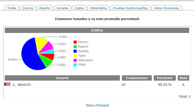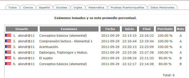 Así como de cada examen individual con su fecha, tiempo por examen y sus resultados.