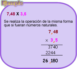 Multiplicación de números decimales Los números decimales se multiplican como si fueran números naturales, con una única diferencia hay que tomar en muy cuenta la cantidad de decimales tanto de multiplicando como del multiplicador para colocar los decimales en el resultado.  |