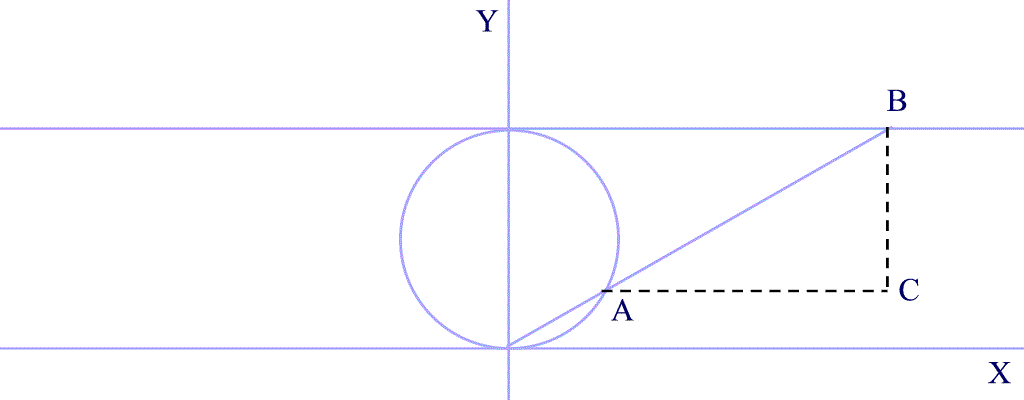 Sea una circunferencia tangente en el origen de coordenadas. Tracemos una tangente a la circunferencia paralela al eje OX. Tracemos una recta AB desde el origen que corte a la tangente. La recta cortará a la circunferencia en un punto que llamaremos A y a la tangente en otro punto que llamaremos B. Calculemos el punto C con la ordenada de A y con la abscisa de B.