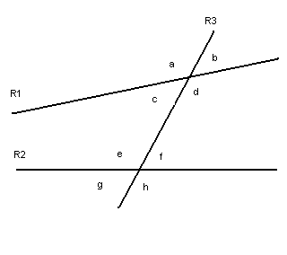 Los ángulos a y h, y, b y g, se llaman ángulos alternos-externos, por estar en distinto lado de la secante (la recta R3) y ser externos.