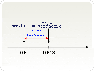 Cuando se utiliza 0.6 como aproximación de 0.613, el error equivale a (0.6-0.613), que es - 0.013 (algunos definen el error como 0.613-0.6). En este caso, el error absoluto es |0.6-0.613|, que es 0.013.