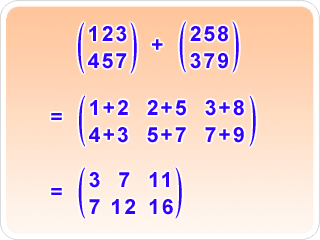 La suma de matrices sólo se puede efectuar entre matrices con la misma dimensión, es decir, las que tienen el mismo número de filas y el mismo número de columnas. La matriz resultante tiene las mismas dimensiones, cada uno de cuyos elementos es la suma aritmética de los elementos en las posiciones correspondientes en las matrices originales.