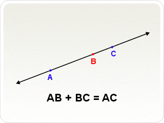 Punto B que se encuentra en la línea que une A y C y que tiene uno de los dos puntos a cada lado de él. Se dice que el punto B está entre los puntos A y C, si y sólo si, AB + BC = AC, en donde AB es la ditancia de A a B, BC es la distancia de B a C y AC es la distancia de A a C.