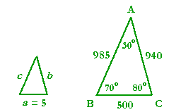 In every triangle with those angles, the sides are in the ratio 500 : 940 : 985. But the side corresponding to 500 has been divided by 100. Therefore, each side will be divided by 100. Side b will equal 9.4 cm, and side c = 9.85 cm.