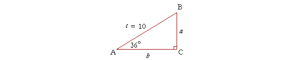 Example 1.   Given an acute angle and one side.   Solve the right triangle ABC if angle A is 36°, and side c is 10 cm.