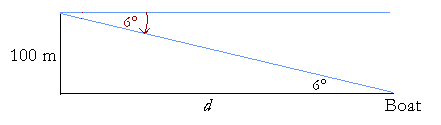 Now, the triangle formed by the lighthouse and the distance d of the boat from the lighthouse, is right-angled.  And since the angle of depression is 6°, then the alternate angle is also 6°. (Euclid, I. 29.)