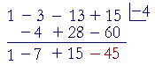 The first three numbers, 1 − 3 − 3, are the coefficients of the quotient, and the final number, −13, is the remainder.