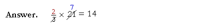 One third of 21 is 7 -- "3 goes into 21 seven (7) times." 2 × 7 = 14.