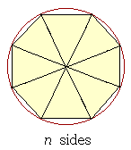 of a circle. To do that, we inscribe in the circle a regular polygon of n sides. As the number of sides increases -- that is, if we consider a sequence of polygons: 60 sides, 61 sides, 62, 63, 64, and so on -- then the sequence of areas of the polygons gets closer and closer to the area of the circle. The area of the circle is their limit. Now, the circle is never equal to a polygon. But by taking n to be a sufficiently large number, the difference between the circle and a polygon will be less than any small number we name. Less even than